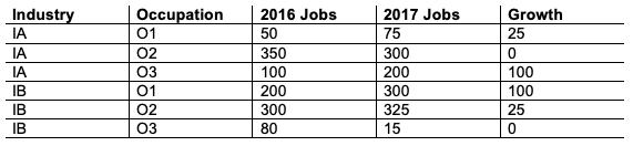 To illustrate how the process works, we can walk through an example using a fake county in which there are two industries and three occupations.Calculate job growth between years. If change is positive, growth = change. If change is negative or 0, growth = 0: