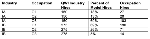 Multiply QWI industry hires figures by the percent model hires figures, breaking each industry’s hires out into hires by occupation: