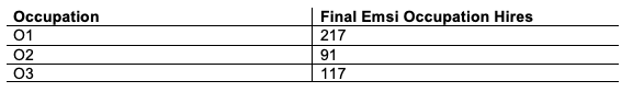 - Since the goal is simply occupation hires not broken out by industry, all hires are summed by occupation. For instance, occupation hires for Loggers are summed from all industries. This yields a final Lightcast hires figure for Loggers (and each other occupation) in each county, for each year.