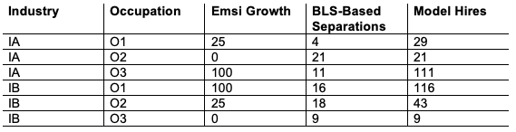 - Sum Lightcast growth and BLS-based separations for each county by industry by occupation node. This results in model hires.