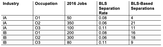 Calculate the number of separations for each industry-occupation combination by multiplying the BLS’s separation rate for the occupation by the earlier year’s employment: