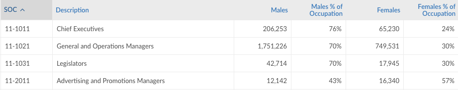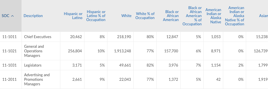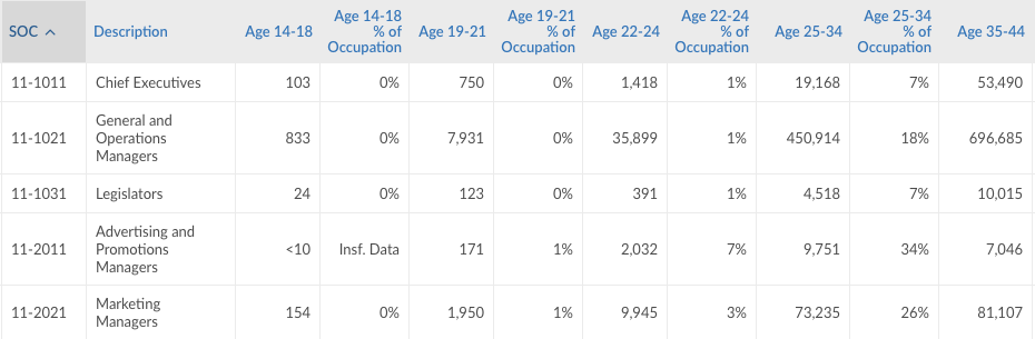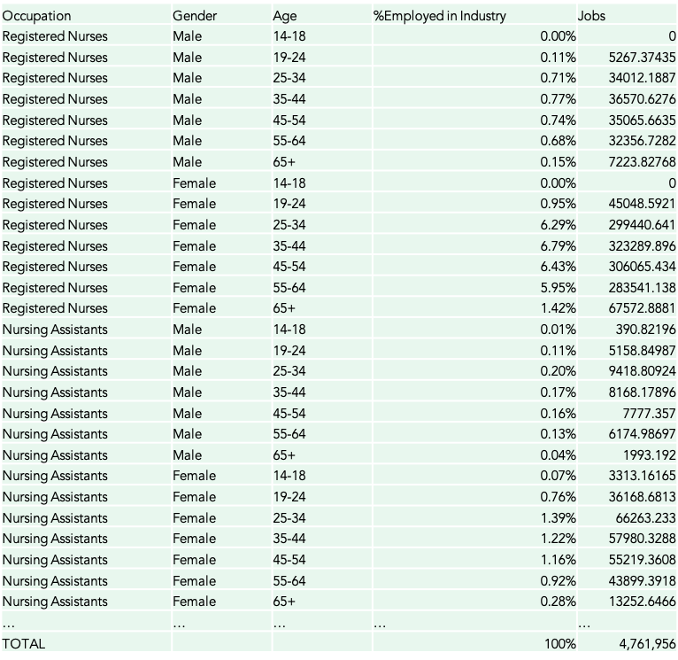 The result is occupation job counts with demographic detail, again by age, gender, or race/ethnicity: