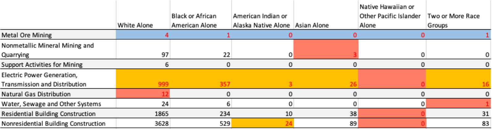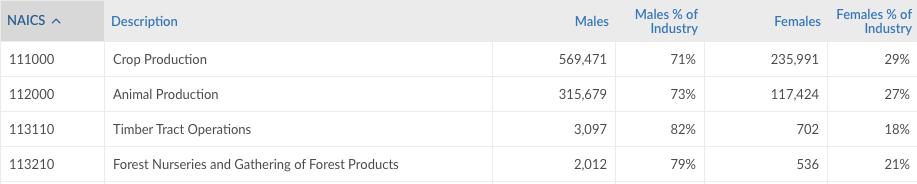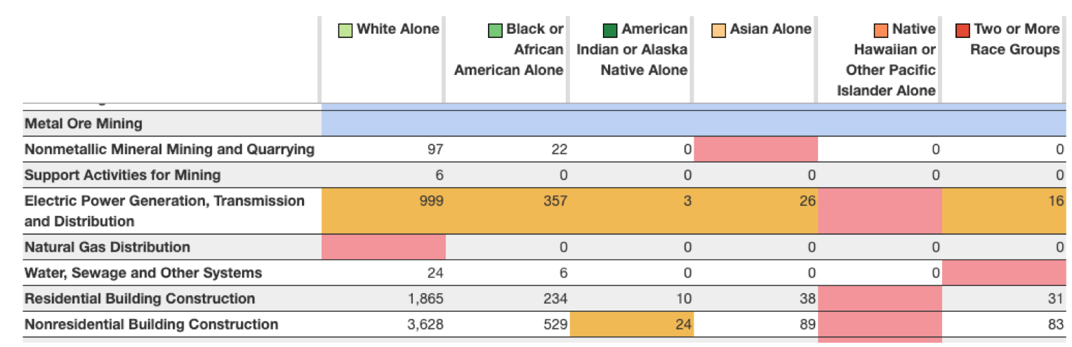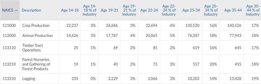 The unsuppressed QWI data is then converted to demographic percentages that show what percent of the jobs in each industry should be allocated to which demographic. This percentage breakout is further enhanced by data from ACS.The result is a percentage breakout for a detailed set of NAICS codes particular to ACS but not as detailed as Lightcast. Where ACS' NAICS codes are not as detailed as Lightcast's, we apply the same QWI/ACS-based breakout to all Lightcast NAICS within the most detailed QWI/ACS category. The final product is Lightcast 6-digit industry job counts, broken out by age, gender, and race/ethnicity: