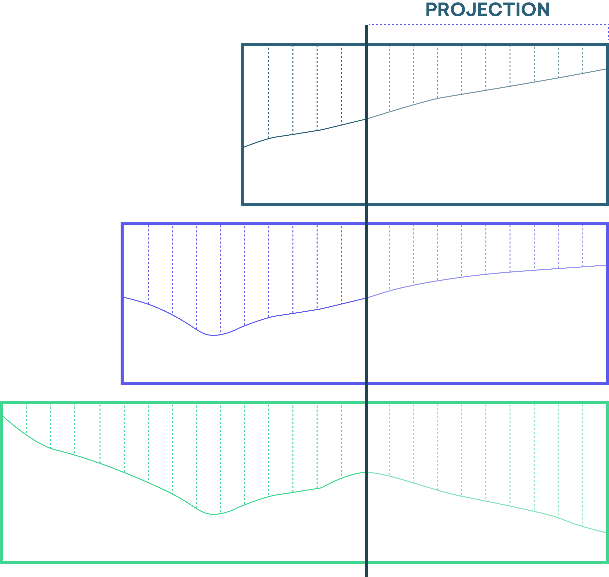 The three projections, based on the various historical trend lines, are then combined into one projection. The projection line is damped, meaning that projected growth or decline is slowed a bit each year. At this point our projection looks like this:
