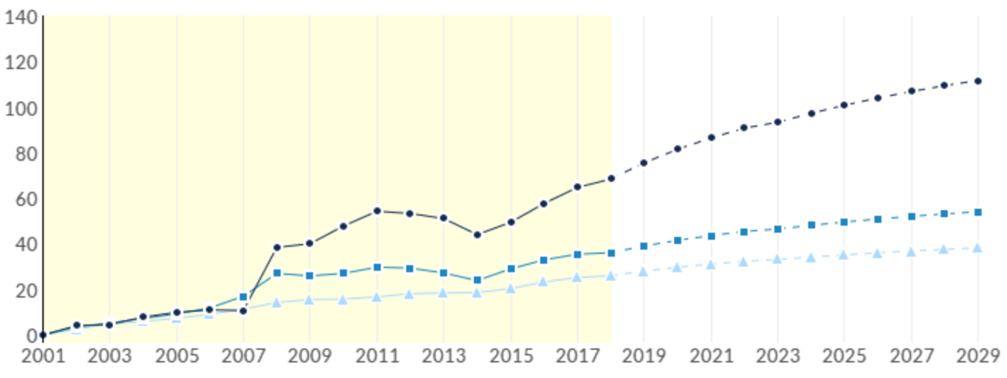 We then project each of those trend lines forward 10 years into the future. The lines are simple projections of historical trends: