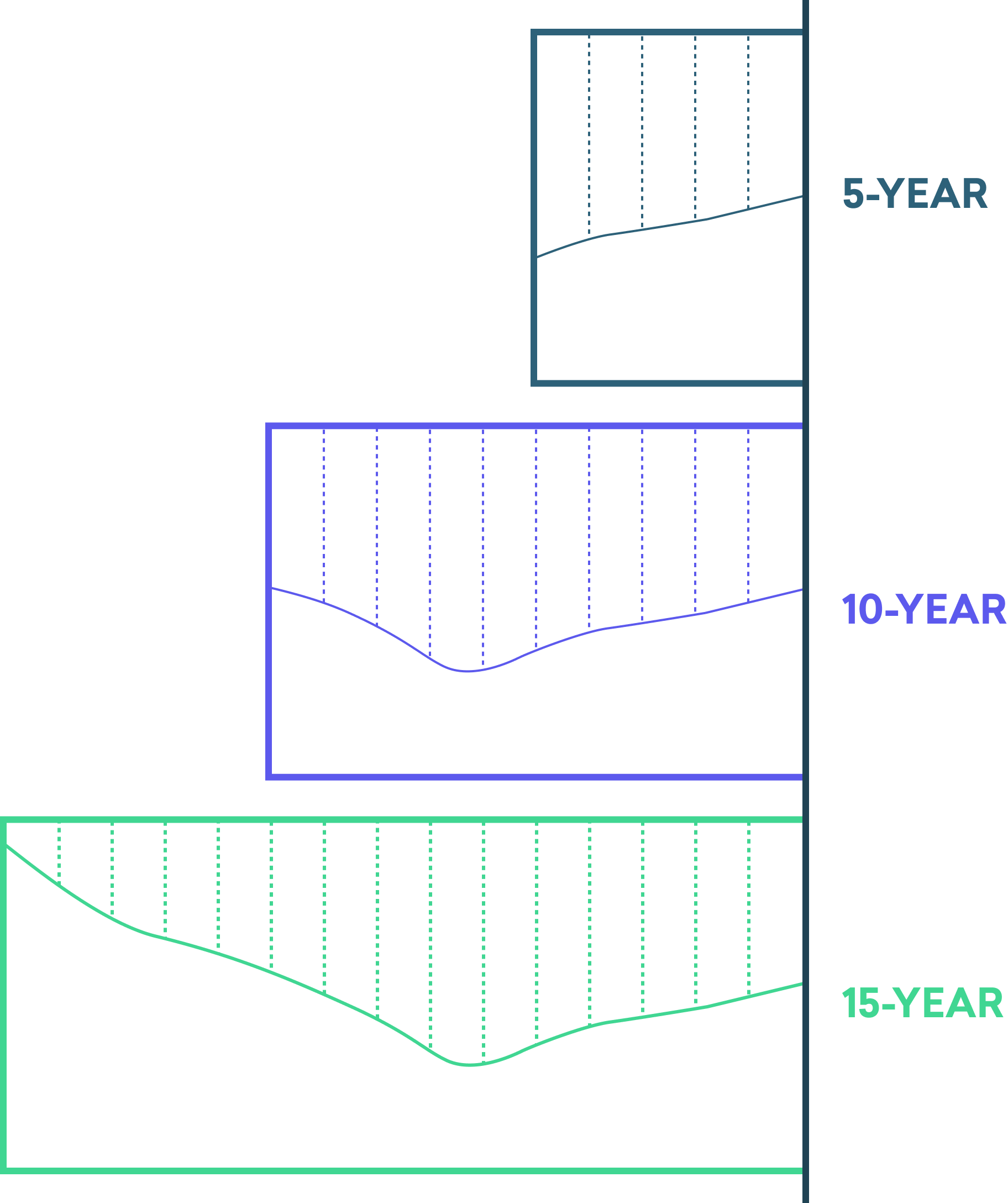 Projections are calculated for each 6-digit NAICS and county combination individually. For each county-industry combination, we begin with final Lightcast industry data and produce three 10-year projection lines based on 5, 10, and 15 years of historical employment data, respectively. The 5-, 10-, and 15-year historical trends might look like this: