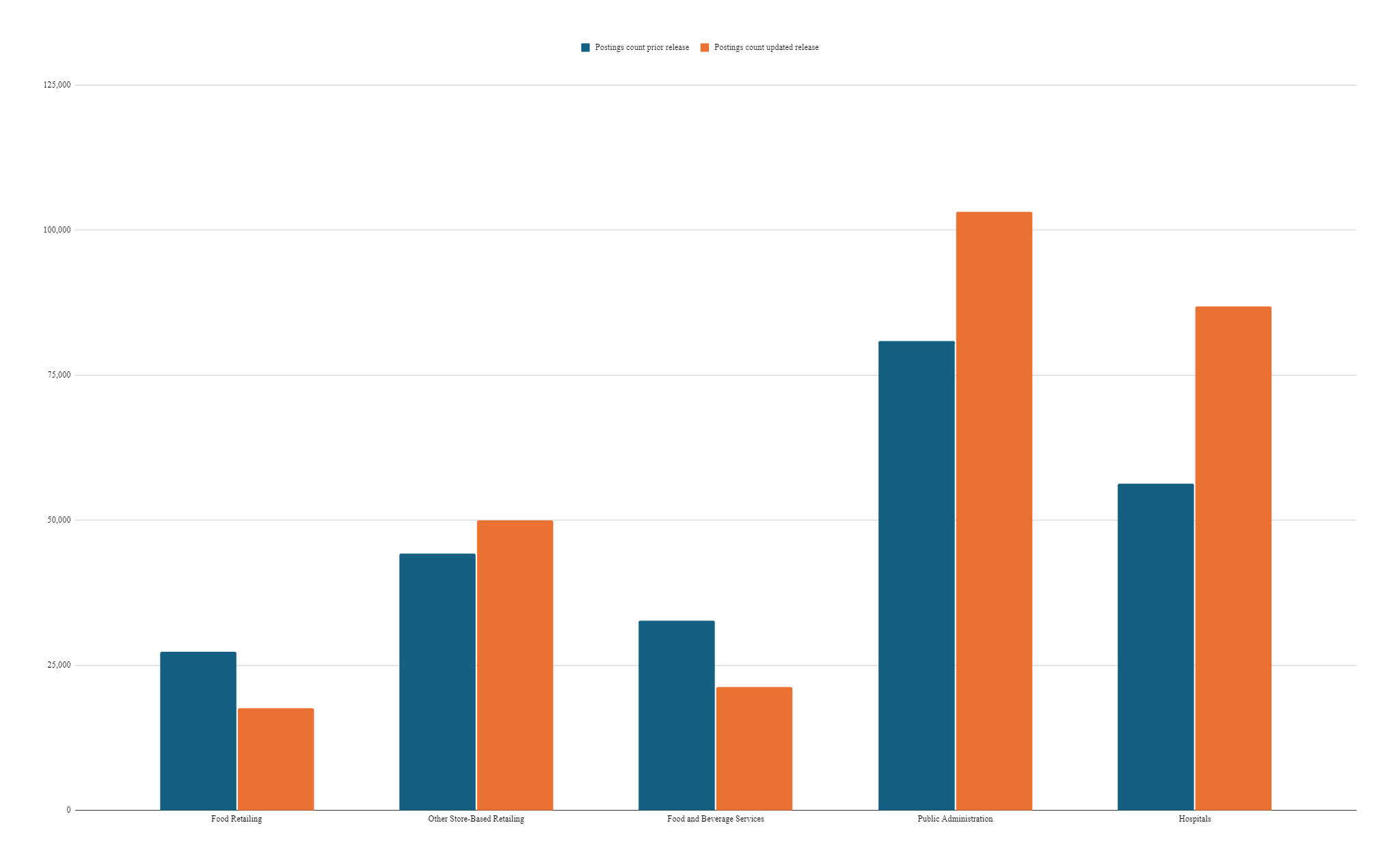 This change is a direct reflection of the new methodology. Lightcast is coding postings to the company, vs the industry that that company employs. For example the company name 'State of New South Wales' from the 9 Sep will be coded to 75 Public Administration vs previously, where it was being partially coded to 75 Public Administration and partially to 84 Hospitals.