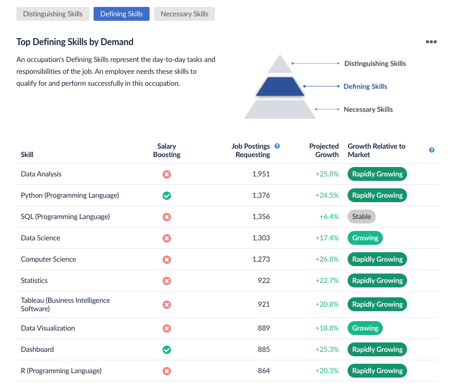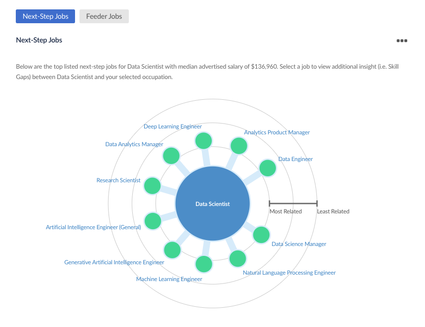 Shows which skills are most commonly required in a role and which are most transferable to other occupations.
