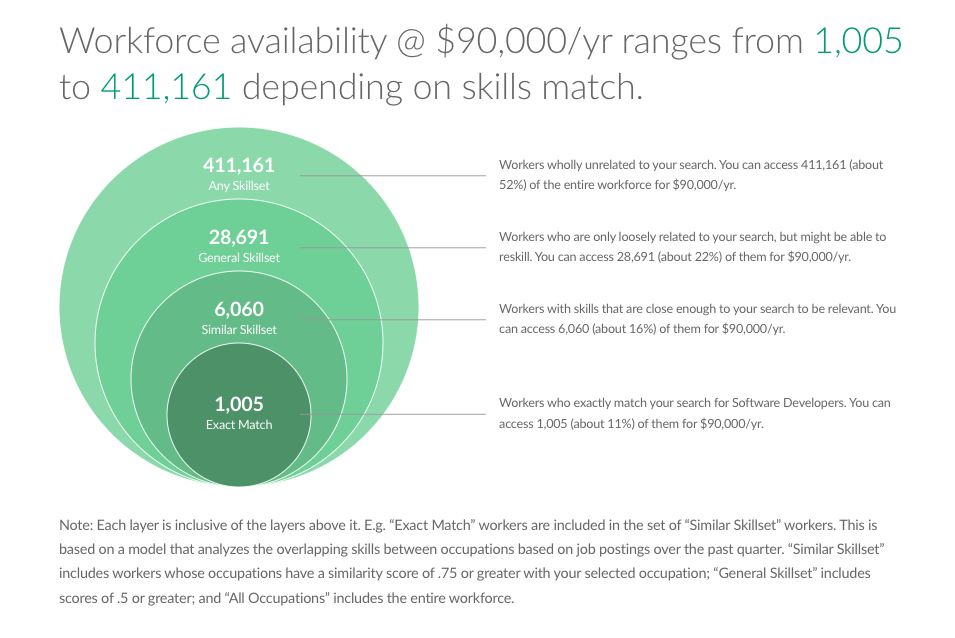 Because the analysis is done at the skill level, it captures the fact that a person’s set of skills can often be applied across multiple occupations. This allows users to uncover hidden demand and see a more complete picture of the labor market.