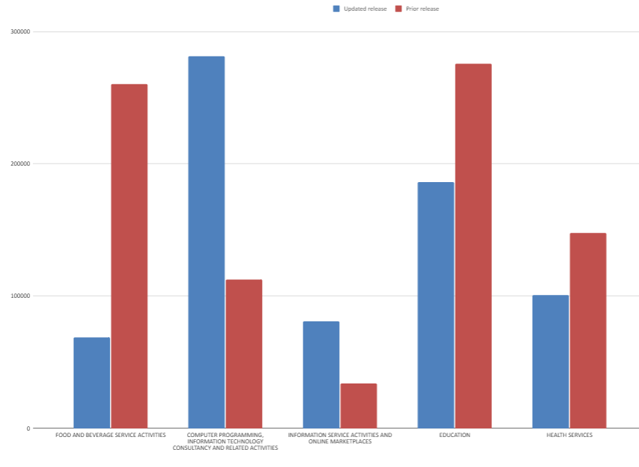Classification of industries will shift on two digit level. Looking at the data between 1 Jan 2020 and 30 June 2024 most significant changes are in the following industries, when filtering out non-employers: